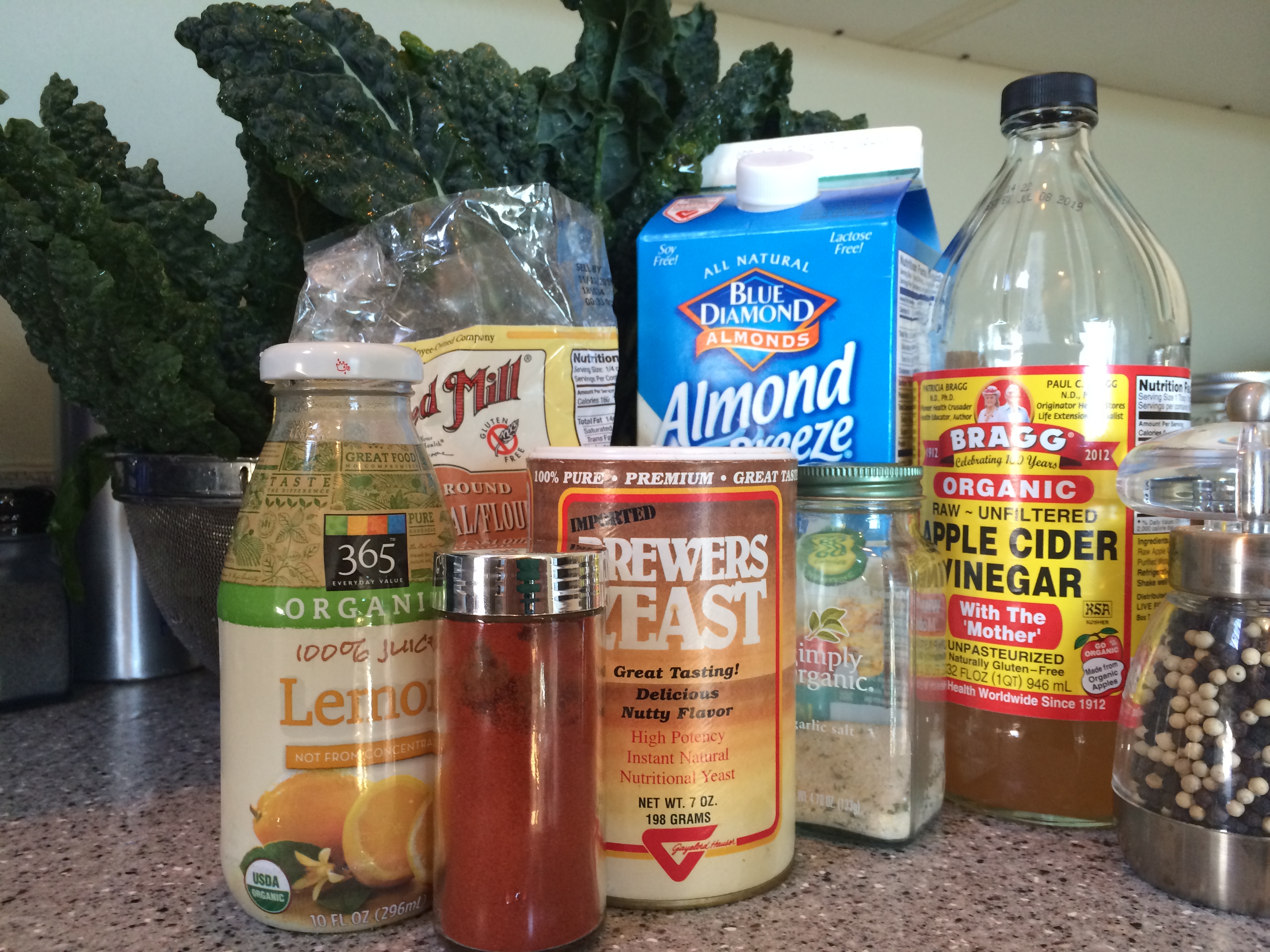Prep dry ingredients: Create a mix of dry ingredients. I throw together almond meal and nutritional yeast in the ratio of about 2:1 (maybe a cup of meal and ½ cup yeast?). Again, you’ll want enough to lightly coat all your kale.