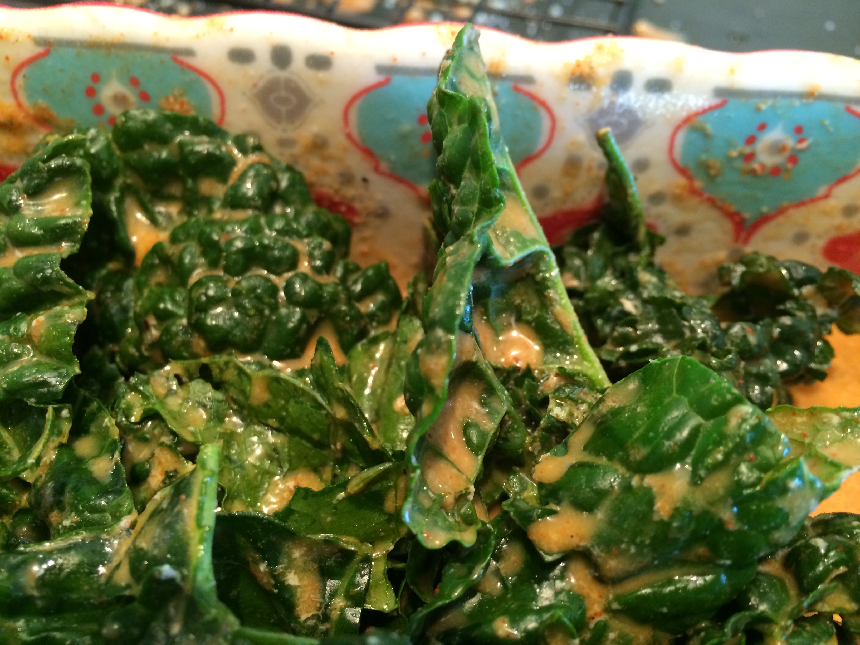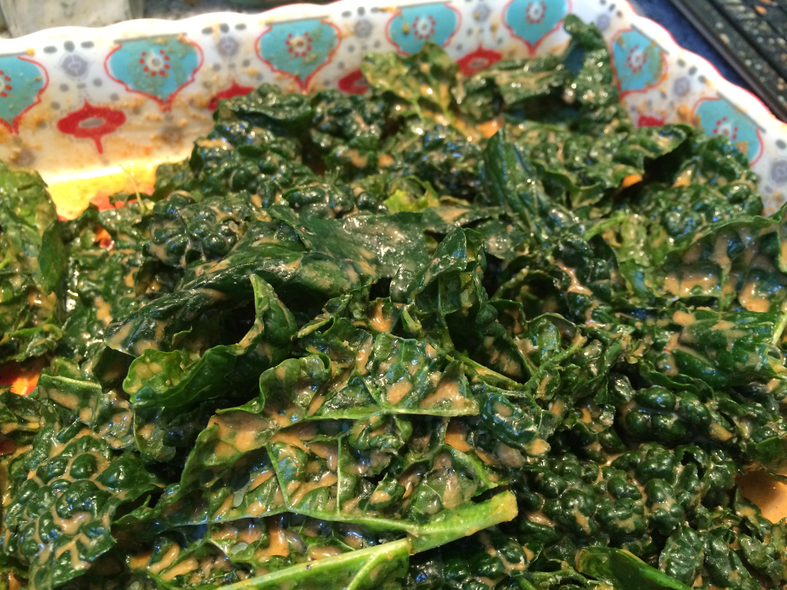 Coat the kale: Soak the kale in the wet ingredients, massaging the kale lightly as if you were creating a kale salad. Then sprinkle with the dry ingredients. [You can take other approaches as well; it doesn’t really matter as long as the kale is covered with whatever deliciousness you want on it. I’ve also just mixed the kale, wet, and dry ingredients all together in a big bowl; it works fine, though the almond meal can distribute unevenly, especially if the surface your kale is particularly bumpy.]