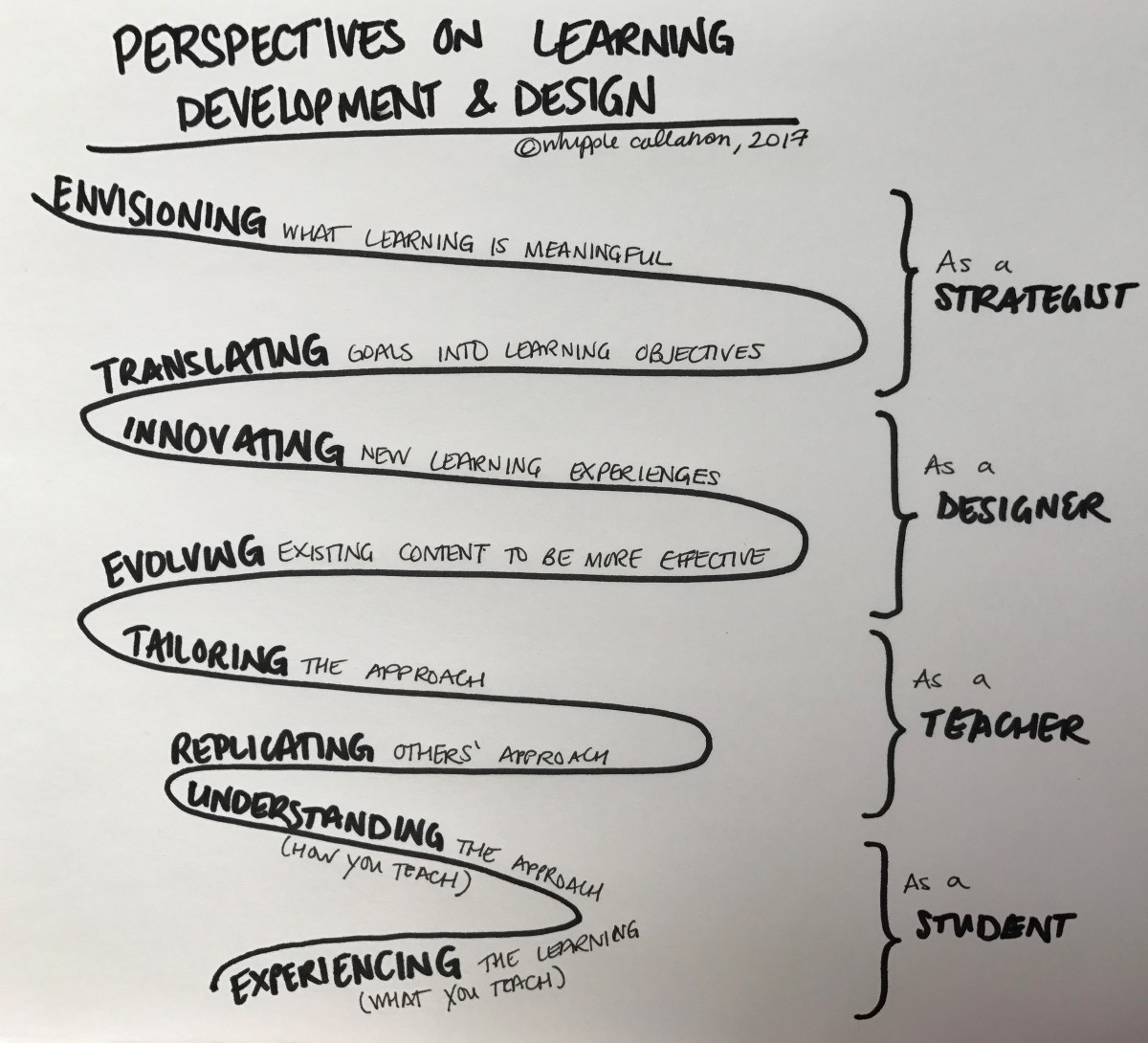 As you see, each stage includes a basic level and a more advanced level before fundamentally shifting focus via a role change (e.g., student to teacher). That said, this framework is not linear. Though some may ‘rise through the ranks’ from student to teacher to designer to strategist, this is not necessary; for example, a strategic thinker with experience in other domains may also strategize about learning. However, the best envisioning strategists are not generalists who see learning experiences as one of many levers to pull to execute a strategy, but those who have moved from student through strategist in this continuum and hold a nuanced understanding of how learning experiences can meaningfully shift human development.